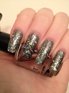 Two coats of China Glaze Tinsel Town, one coat of Forever 21 Silver (large and small holo glitter) over that and then one coat of Sally Hansen In the Spotlight (holo bar glitter) over that. Then of course trusty Seche Vite to smooth everything out.  Sorry this is a little blurry, but you can enlarge it to get the details of the various glitters I used.